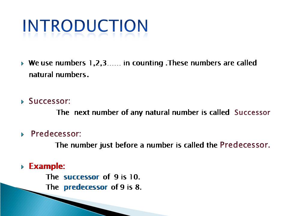 2. if you add one (1) to a natural number , we get its successor. if you subtract (1) from a natural number , we get its predecessor.